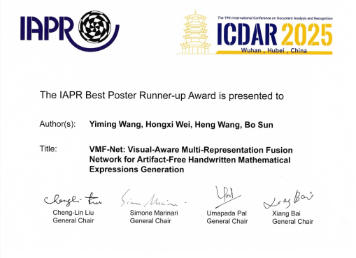 ICDAR(International Conference on Document Analysis and Recognition,简称ICDAR)是国际模式识别学会在文档分析与识别领域的旗舰会议。ICDAR 2025于9月16日-21日在武汉召开,本次会议共收到有效投稿论文314篇,最终40篇论文被录用为口头汇报(录用率12.7%),102篇论文被录用为海报展示(录用率32.5%)。人工智能学院2023级博士生王一明与其导师魏宏喜教授合作的2篇论文“DCC:Plug-and-Play Dynamic Category Compression for Enhanced Handwritten Text Generation”和“VMF-Net: Visual-Aware Multi-representation Fusion Network for Artifact-Free Handwritten Mathematical Expressions Generation”,分别荣获最佳学生论文亚军奖(Best Student Paper Runner-up Award)和最佳海报亚军奖(Best Poster Runner-up Award)。
