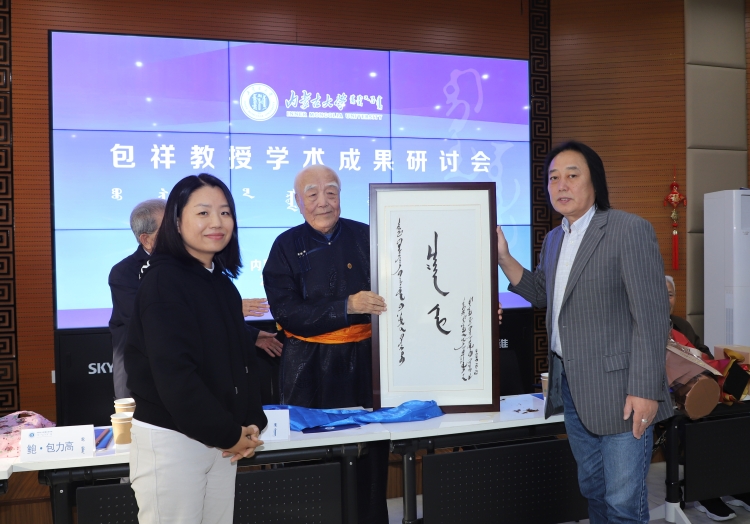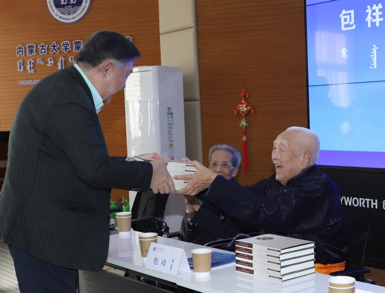在赠书仪式上,包祥教授对学校、学院及出版社在文集出版过程中所给予的高度重视与鼎力支持表示衷心感谢,并向为文集编纂付出辛勤努力的各位同仁致以诚挚敬意。他深情回顾了建校初期创办蒙古语言文学系的峥嵘岁月,分享了自己投身蒙古语言文字研究的初心与治学历程,并简要介绍了文集中《蒙古文字学》《巴尔虎土语》《语言学概论》《孝经:蒙译本》《论文集》等五部著作的核心内容与学术价值。
