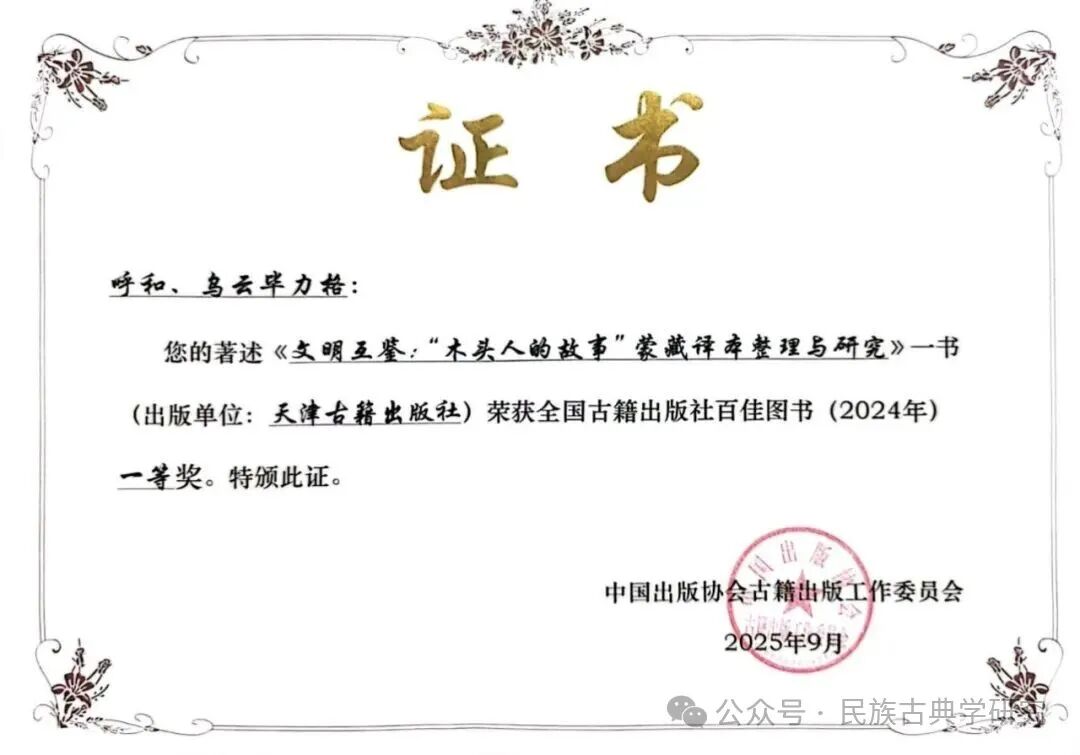 近日,由中国出版协会古籍出版工作委员会主办,贵州出版集团、贵州人民出版社承办的第38届全国古籍出版社社长年会在贵阳市召开。内蒙古大学民族古典学高等研究院呼和博士与乌云毕力格教授编著的《文明互鉴:“木头人的故事”蒙藏译本整理与研究》一书,荣获2024年度“全国古籍出版社百佳图书”一等奖。该著作以跨文化视野为基础,对《木头人的故事》的蒙藏译本进行了系统梳理与深入研究。