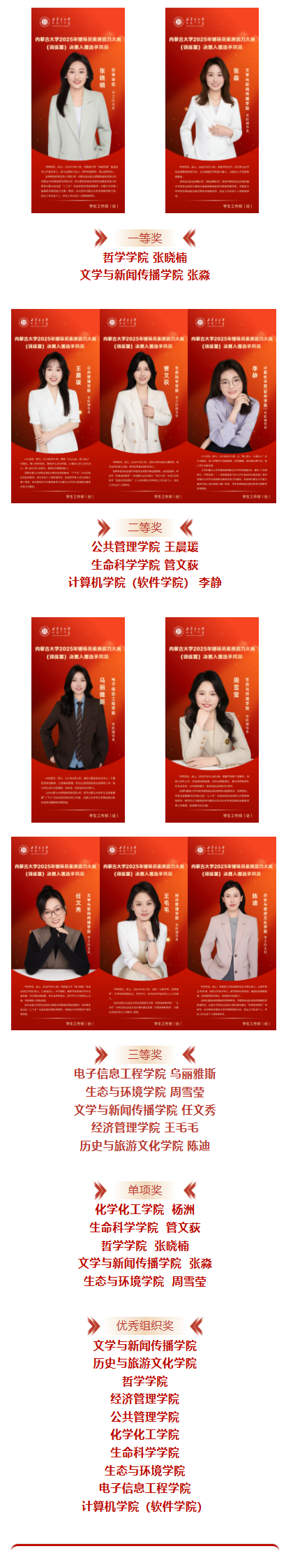 经过激烈角逐,大赛最终评选出一等奖2名、二等奖3名、三等奖5名、单项奖5名及优秀组织奖10个。各位参赛辅导员在赛场之上展风采、亮本领、比担当,无论是理论宣讲的精准阐释、案例分析的深刻洞察,还是谈心谈话的温情疏导,都充分展现了内大辅导员政治强、情怀深、思维新、视野广、自律严、人格正的良好风貌,彰显了作为高校思政工作“主攻手”、学生成长“主心骨”的责任与担当。