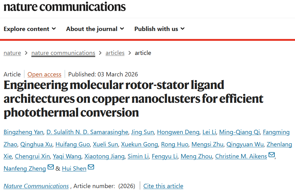 近日,我校能源材料化学研究院沈慧团队在国际顶级期刊Nature Communications上发表研究论文“Engineering molecular rotor-stator ligand architectures on copper nanoclusters for efficient photothermal conversion”,这是该团队在一个月内连续发表的第二篇Nature子刊文章。