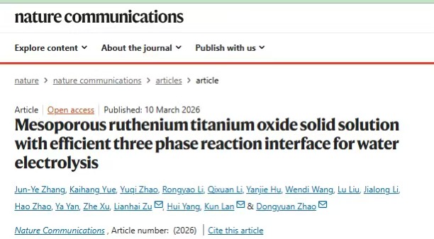 近日,我校能源材料化学研究院赵东元院士/兰坤教授团队与中国科学院上海高等研究院祖连海研究员,在期刊Nature Communications上发表题为“Mesoporous Ruthenium Titanium Oxide Solid Solution with Efficient Three Phase Reaction Interface for Water Electrolysis”的研究论文。